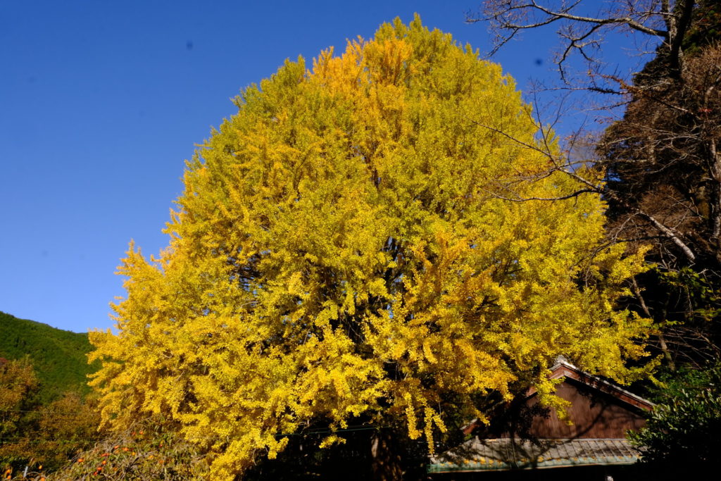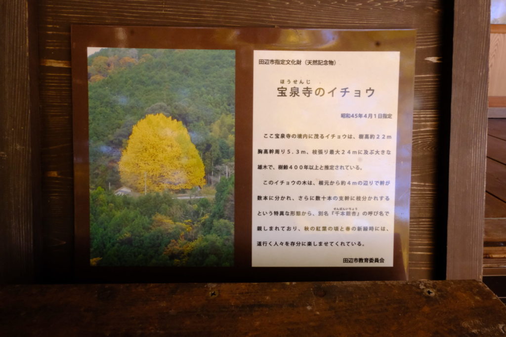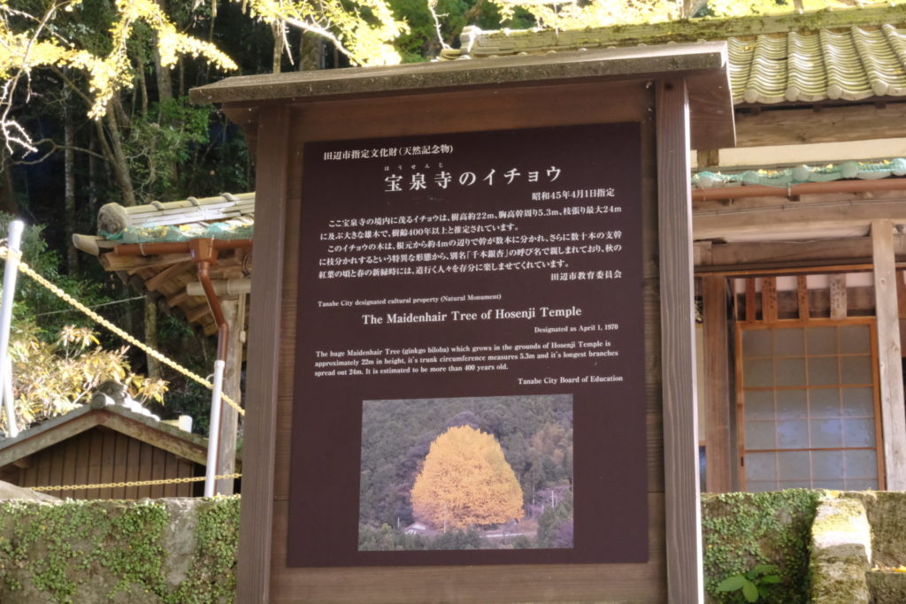 福定は田辺市中辺路町にある小さな集落です。戸数は40軒もありません、大半が高齢者で締められています。そこにあるのが宝泉寺。現在は住職もいません。そこの境内にあるのが大きな銀杏の木なのです。地域の人の話によると、「木を守ることも難しくなっている」とのこと