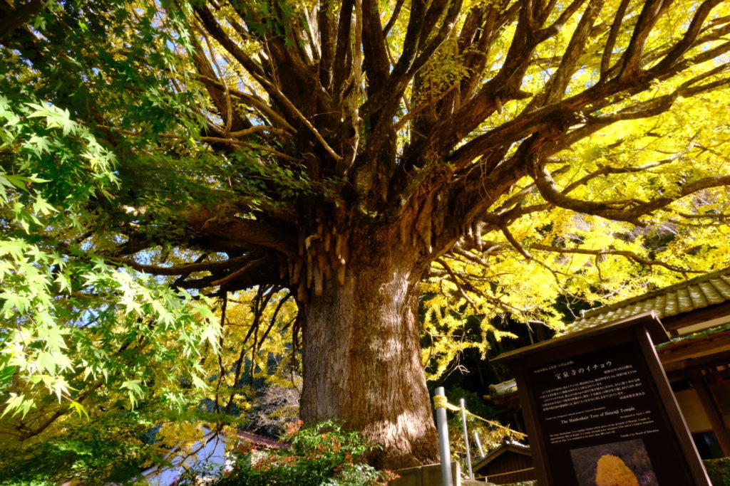 福定の大銀杏は、福定の宝泉寺境内にある樹齢、推定400年の大銀杏で、田辺市指定天然記念物です。幹の周囲5.3m、高さは22m。根元から高さ4mで幹が数本に分かれた大木です。