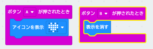 すごいことに気づいたね。素晴らしい、その発想ができるなんてたいしたもんだ。それでは、Bボタンを押したら消えるようにしよう。そのためには、下のようにパーツを組んで、AをBに変えるんだ