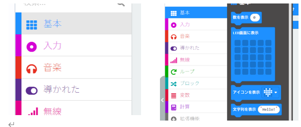 それではプログラムにかかろう。中央のボックスから基本を押して下さい。そうすると、下のように「アイコンを表示」をプログラムエリアにドラッグして下さい。
