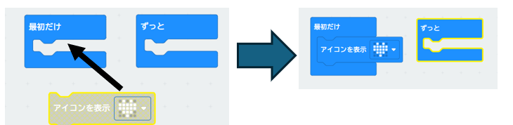 それでは、Aボタンを押したときに、LEDを点灯するようにプログラムします。それには、「ずっと」「最初だけ」はいらないので、下のように、中央のパーツの中にマウスでドラッグしてはなします。すると中央が赤くなって「ずっと」「最初だけ」がプログラムエリアから消えます。