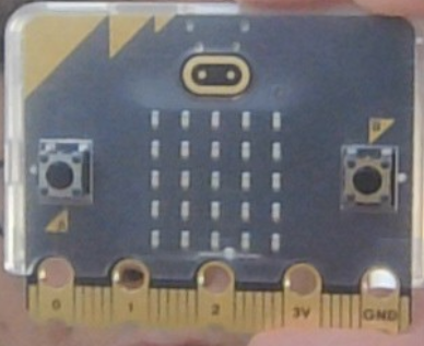 とにかく見てみよう。これがマイクロビットだよ。真ん中には25個のLEDがあって、これが光センサーにもなっている。そして、両端には、黒い二つのボタンがある。左がAボタン、右がBボタンだ。今回は、このボタンを押して、LEDをつけたり、消したりするプログラムを作るぞ。